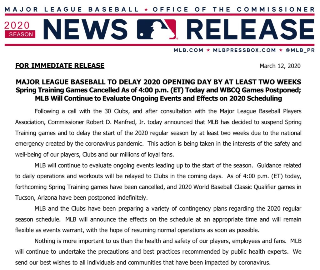 And as it pertains to this blog, Major League Baseball Spring Training has been canceled while the regular seasons for both MLB and Minor League Baseball has been delayed by at least two weeks.
